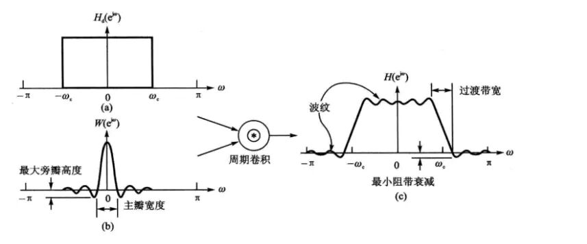 由于 FIR 滤波器并不能像理想滤波器那样突然切换(即从 0 到 -∞),因此在过渡带中,滤波器的增益会逐渐下降。这种过渡区的宽度与窗函数的选择密切相关。窗函数的主瓣宽度决定了过渡带的宽度。窗函数的主瓣越宽,过渡带就越宽,如果过渡带过于窄,滤波器将无法实现理想的通带和阻带响应,导致性能下降。