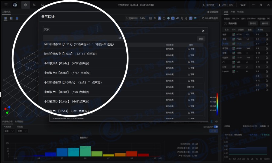 针对不同教室类型与教学场景,艾力特积累了丰富的参考设计方案,用户可快速调用教室设计模型,结合空间条件、教学需求与系统配置,通过仿真分析提前评估声环境效果;在项目落地后,再以现场测量和验收验证为依据,推动教室声环境建设进入可分析、可优化、可测量、可验收的实施路径。